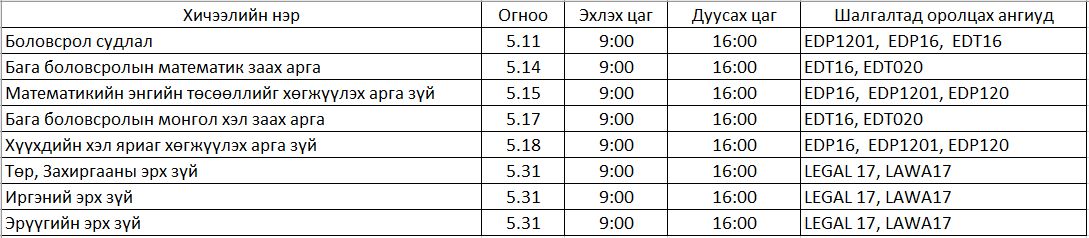 Шалгалтад оролцохын өмнө танд дараах зүйлс заавал байвал зохино.Интернетийн сүлжээнд холбогдсон компьютер, moodle.ecl.mn системд нэвтрэх оюутны эрх. Улсын шалгалтыг 100 асуулт бүхий тестийн тусламжтай авах болно. Шалгалт 9:00 нээгдэж 16:00 цагт хаагдах болно. Нэг өдөр олон шалгалт давхацсан бол цаг хугацаагаа тооцож шалгалтуудад оролцоно уу.