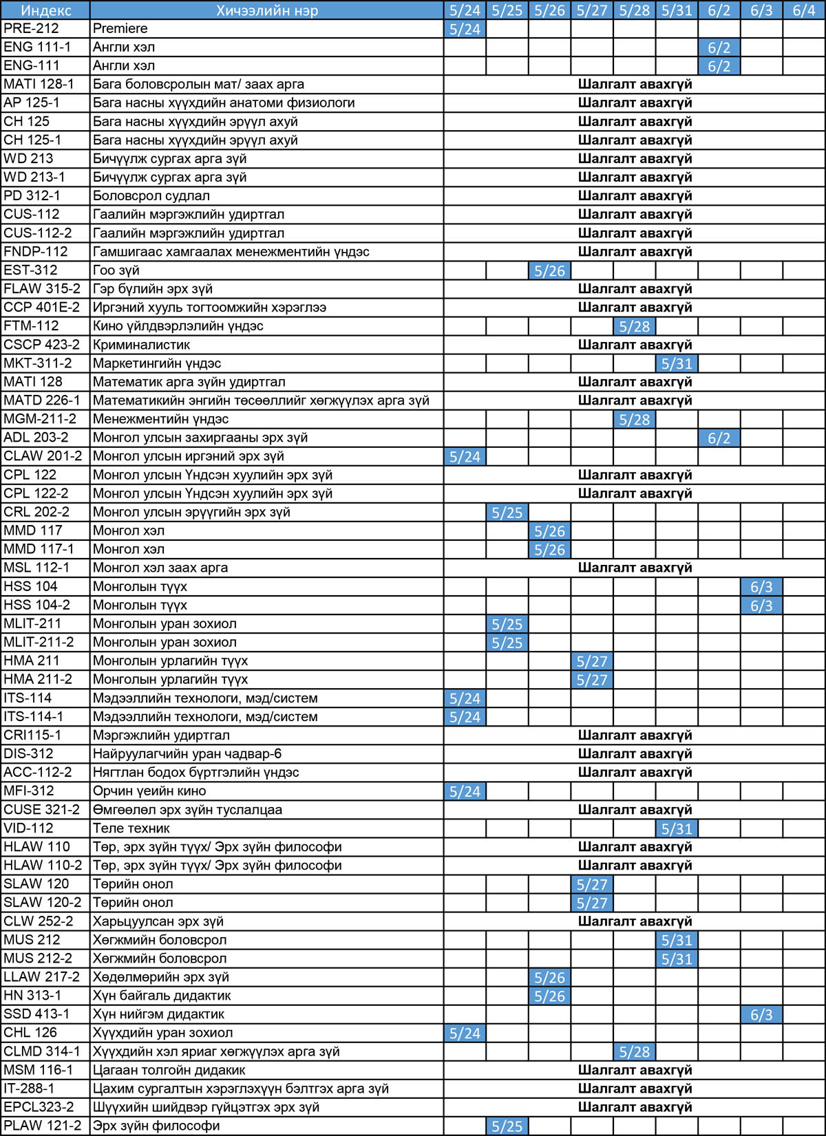 Шалгалтад оролцохын өмнө танд дараах зүйлс заавал байвал зохино. Интернетийн сүлжээнд холбогдсон компьютер, moodle.ecl.mn системд нэвтрэх оюутны эрх. Батлах шалгалтыг 50-100 асуулт бүхий тестийн тусламжтай авах болно. Шалгалт 9:00 нээгдэж 16:00 цагт хаагдах болно. Оюутан оноогоо тухайн шалгалт авсан өдрийн 17 цагт харах боломжтой болно. Шалгалт авахгүй хичээлүүд нь ирц, бие даалт, явцын оноогоор дүгнэгдэнэ. Нэг өдөр олон шалгалт давхацсан бол цаг хугацаагаа тооцож шалгалтуудад оролцоно уу.