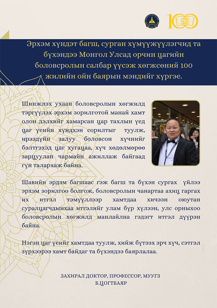 Эрхэм хүндэт багш, сурган хүмүүжүүлэгчид та бүхэндээ Монгол Улсад орчин цагийн боловсролын салбар үүсэж хөгжсөний 100 жилийн ойн баярын мэндийг хүргэе.