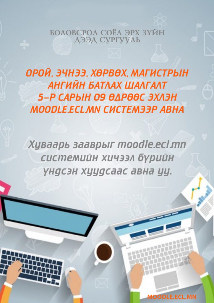 Боловсрол соёл эрх зүйн дээд сургуулийн 2021-2022 оны хичээлийн жилийн II улирлын эчнээ, хөрвөх, орой, магистрын ангийн батлах шалгалт 5-р сарын 9 өдрөөс moodle.ecl.mn системээр цахим хэлбэрээр авах болно. Шалгалтын хуваарь, зааврыг moodle.ecl.mn системийн хичээл бүрийн үндсэн хуудсаас авна уу. Шалгалт нь тухайн өдрийн 9 цагаас 17 цагийн хооронд авах болно. Оюутан хүссэн үедээ шалгалтад оролцох бөгөөд шалгалтыг эхлүүлсэн бол 30-90 минутын хугацаанд дуусгана. Шалгалтын хугацаа нь тухайн хичээлээс хамаарч өөр өөр байна. Хэдэн цагт шалгалтаа эхлүүлснээс үл хамаарч 17:00 цагт шалгалт автоматаар хаагдана. Түн тухайн өдрийн 17:30 цагт “Батлах шалгалтад энд дарж оролцоно уу” холбоос дээр байршуулах болно. Өдрийн ангийн оюутнууд нь батлах шалгалтаа танхимаар өгөх болно.