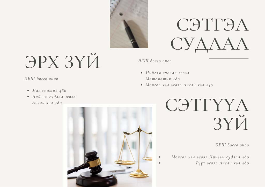 АЖЛЫН БАЙР: Хууль сахиулах, Шүүх, Прокурор, Цагдаа, Шүүхийн шийдвэр гүйцэтгэх байгууллагад болон өмгөөллийн чиглэлээр ажиллах боломжтой.
