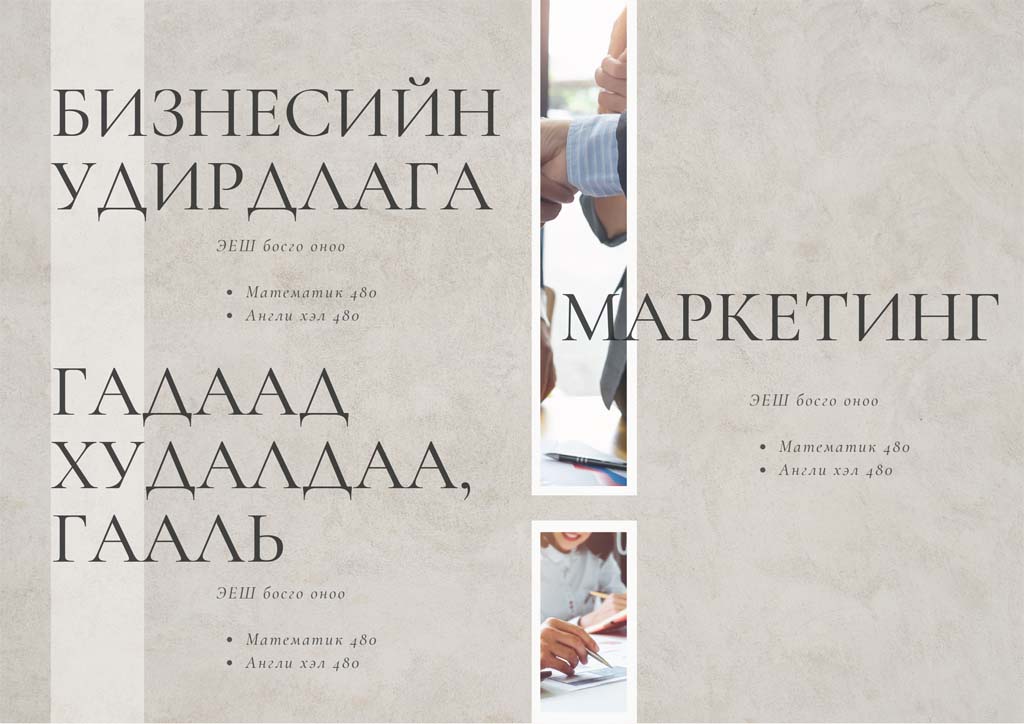 ЭЛСЭЛТИЙН ЕРӨНХИЙ ШАЛГАЛТ: Нийгэм судлал эсвэл математик 480 оноо, Монгол хэл эсвэл англи хэл 440 оноог авсан байх.